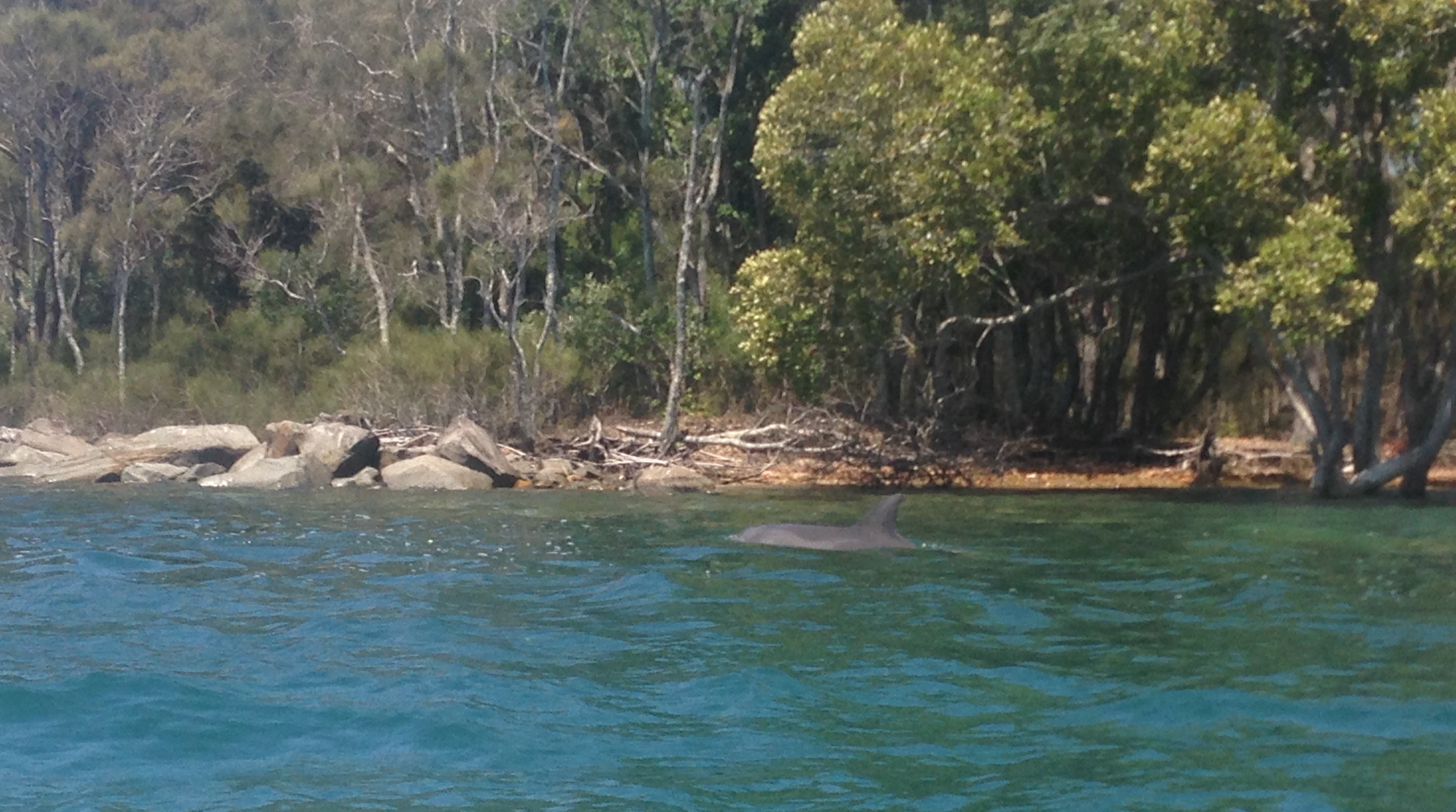 As we paddled along in the welcome shelter of an island, two fins emerged near our kayak. Then another baby-sized fin popped up. Then a big, darker fin.